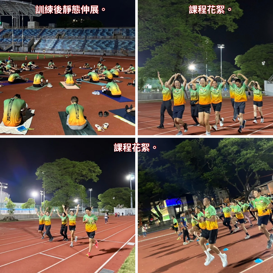 - 課程中有團體性課表,採能力分組(A/B/C/D/E...),週間實體課程設計跑步專業訓練,為提升訓練之品質強度,採分組個人化課表。