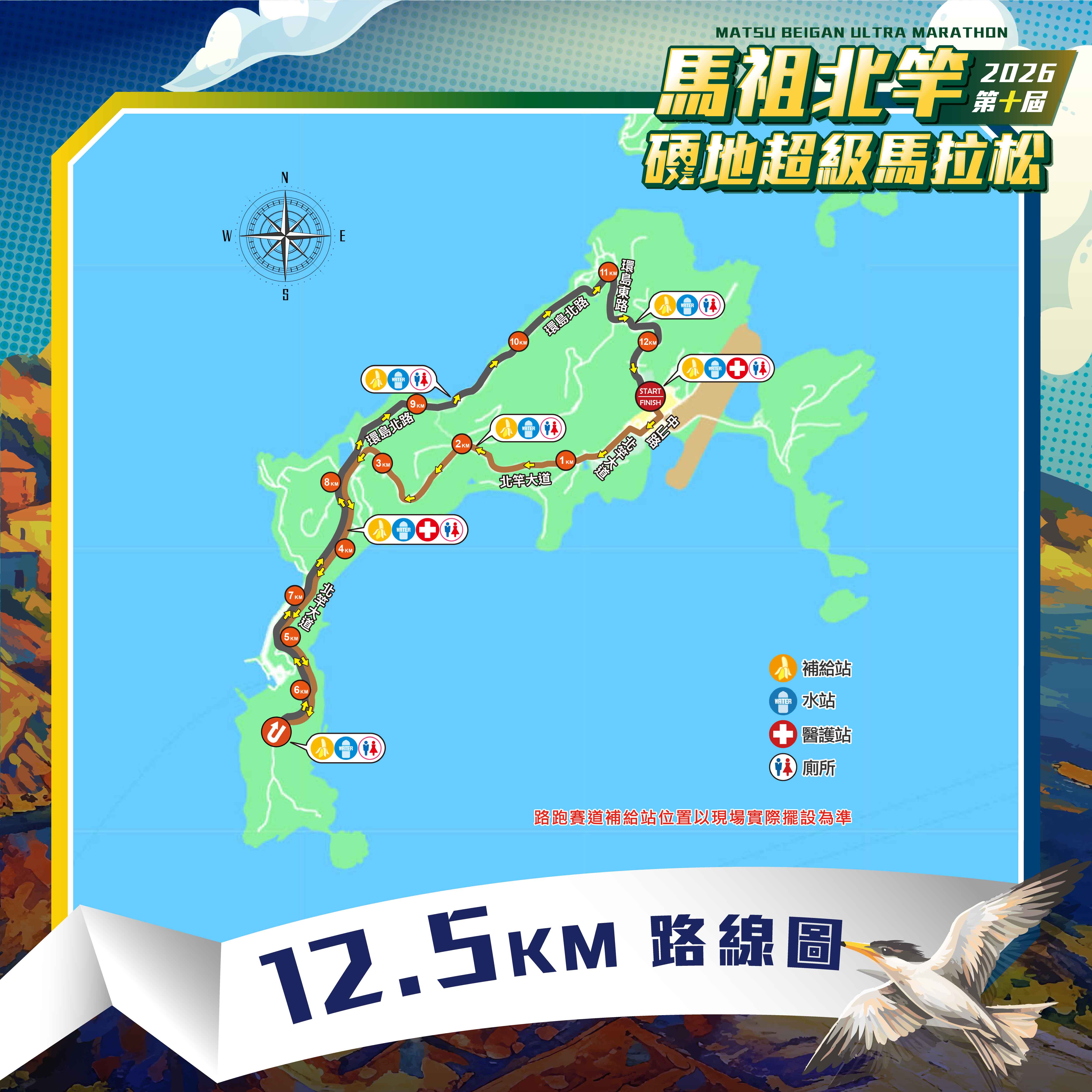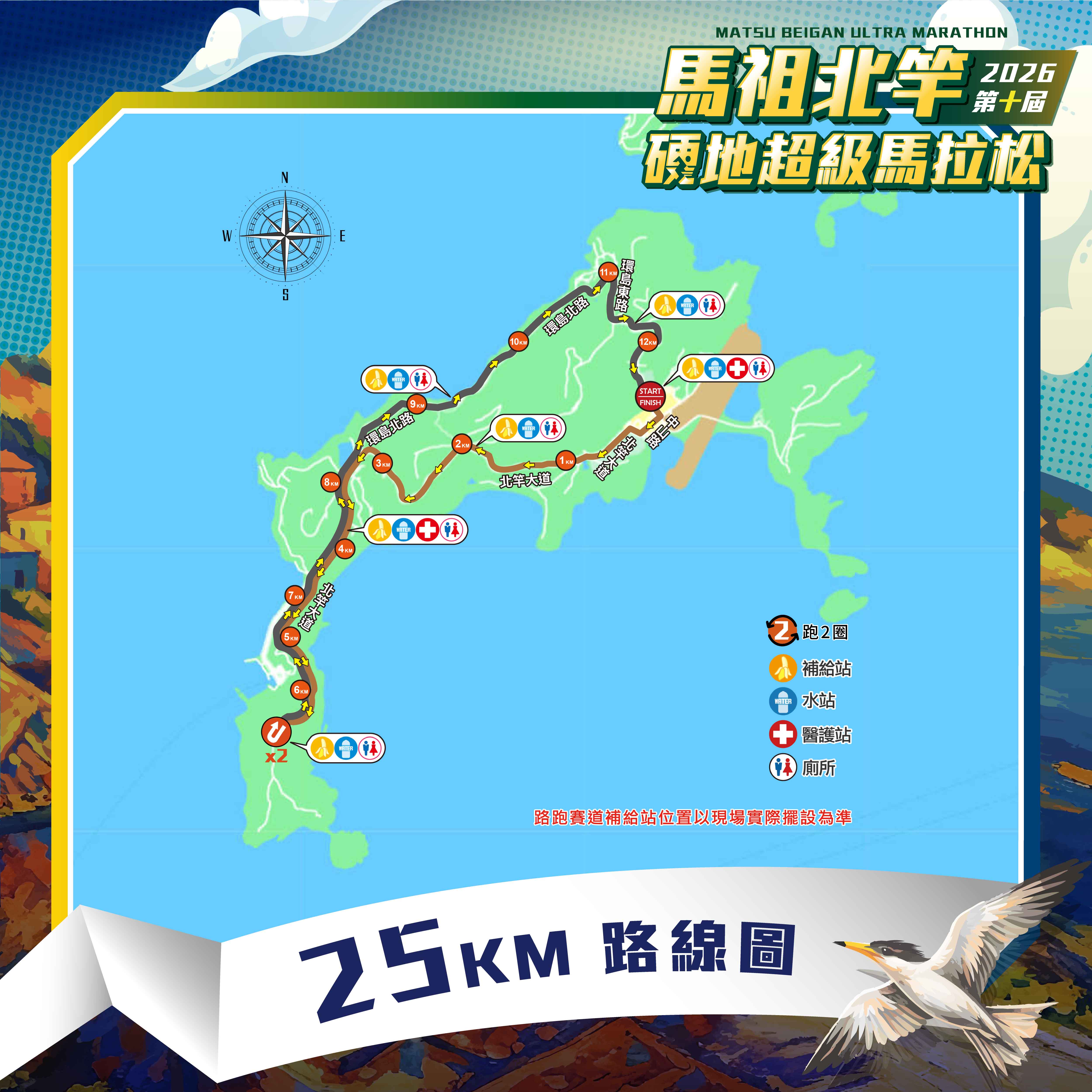 路線:起點(START)→直行中正路→右轉中山路→直行北竿大道→尼姑山折返→左轉環島北路→右轉環島東路→直行中正路→終點(FINISH)