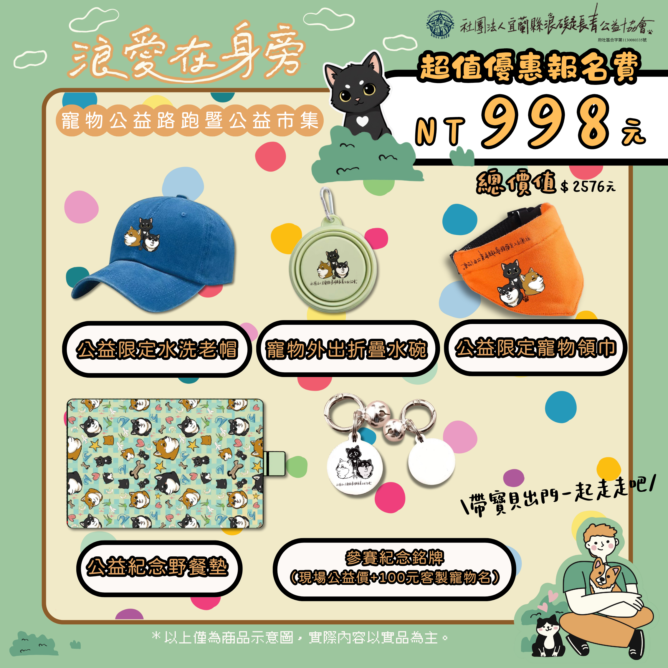 公益限定水洗老帽($1,080)、寵物領巾($299)、寵物玩具($199)、公益紀念野餐墊($599)、寵物外出摺疊水碗($399)。