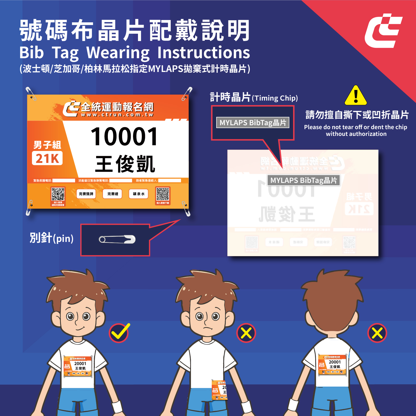 - 正確佩戴位置:請將號碼布以別針四角穩固於胸前或腹部正前方,避免佩戴於側身或後背,以確保感應效果最佳。