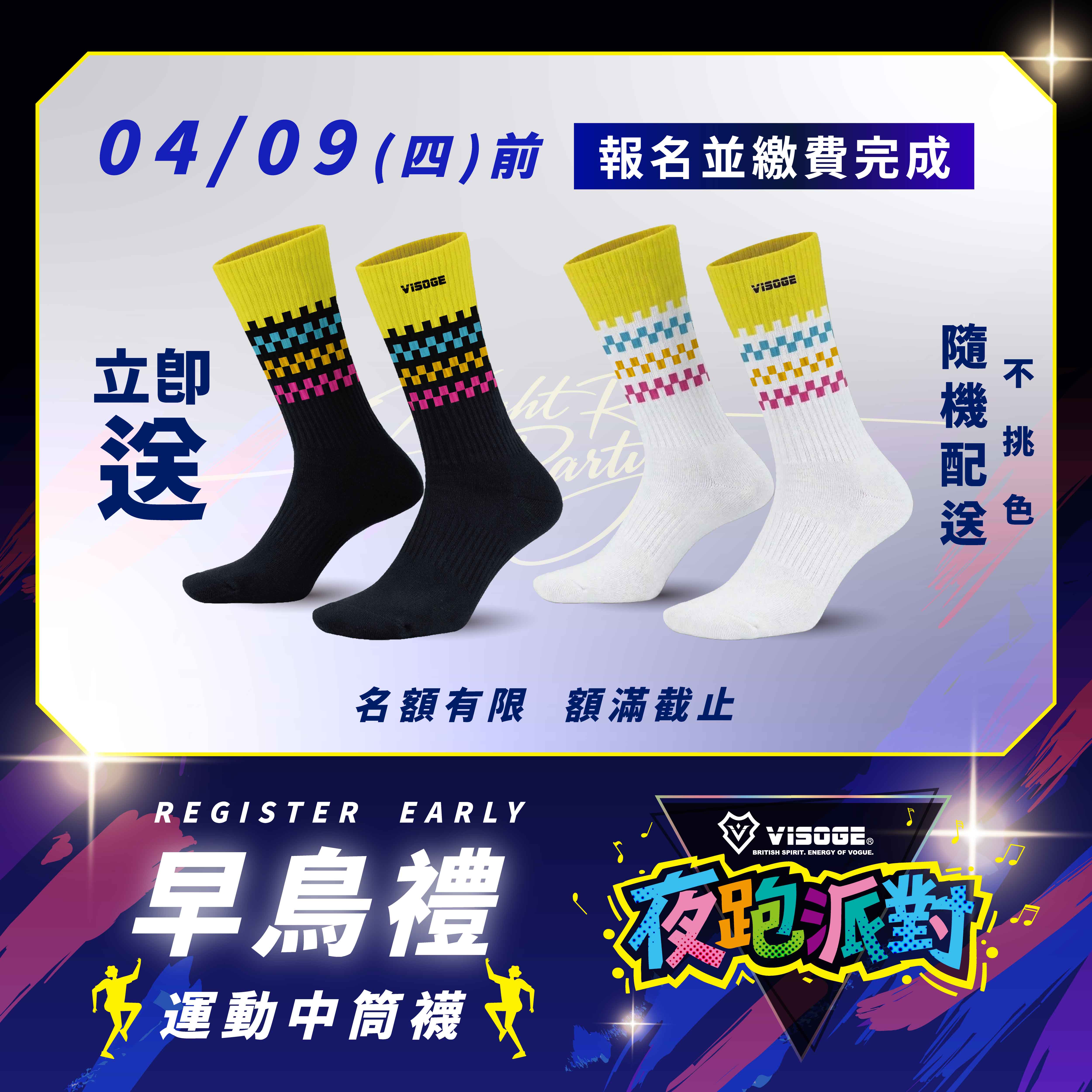 ➤ 早鳥報名禮:運動中筒襪 乙雙(隨機配送,不挑色)。