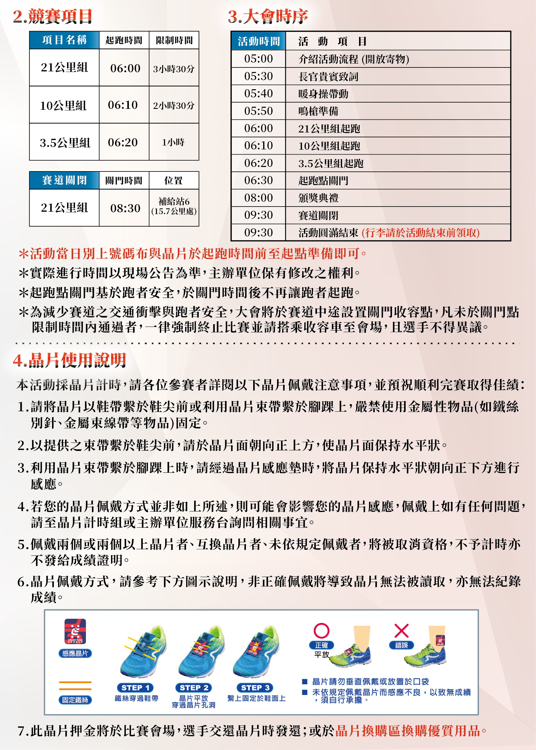 - 晶片異常以及晶片相關問題,請至「成績異常區/裁判區」帳篷處理,申請補發晶片請於第一組公里數開跑前30分鐘辦理,未提前30分申請恕不補發晶片,辦理時需出示報名人的(身分證件),並另付押金100元。(活動後可退還)。
