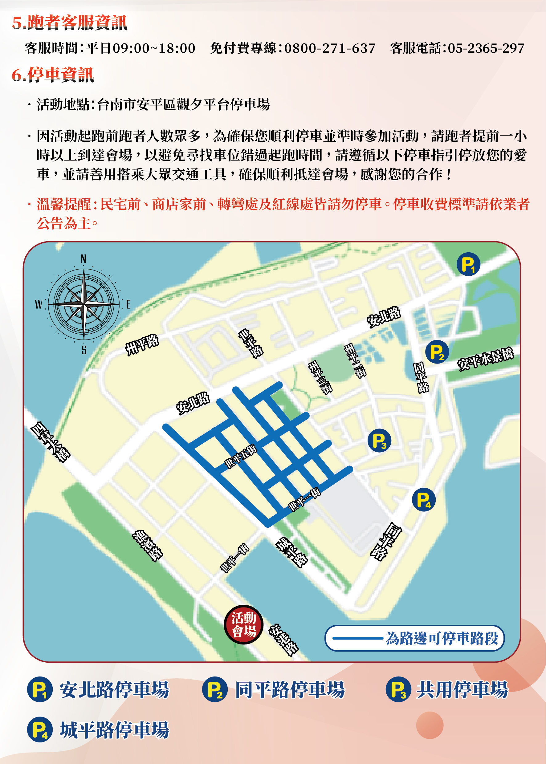 - 停車注意事項:因活動起跑前跑者人數眾多,為確保您順利停車並準時參加活動,請跑者提前一小時以上到達會場,以避免尋找車位錯過起跑時間,請遵循以下停車指引停放您的愛車,並請善用搭乘大眾交通工具,確保順利抵達會場,感謝您的合作!