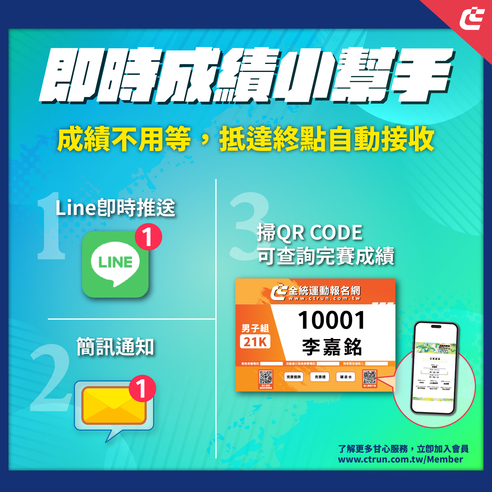 - 完賽後,請使用手機掃描號碼布上的QRcode,前往查詢成績資訊。