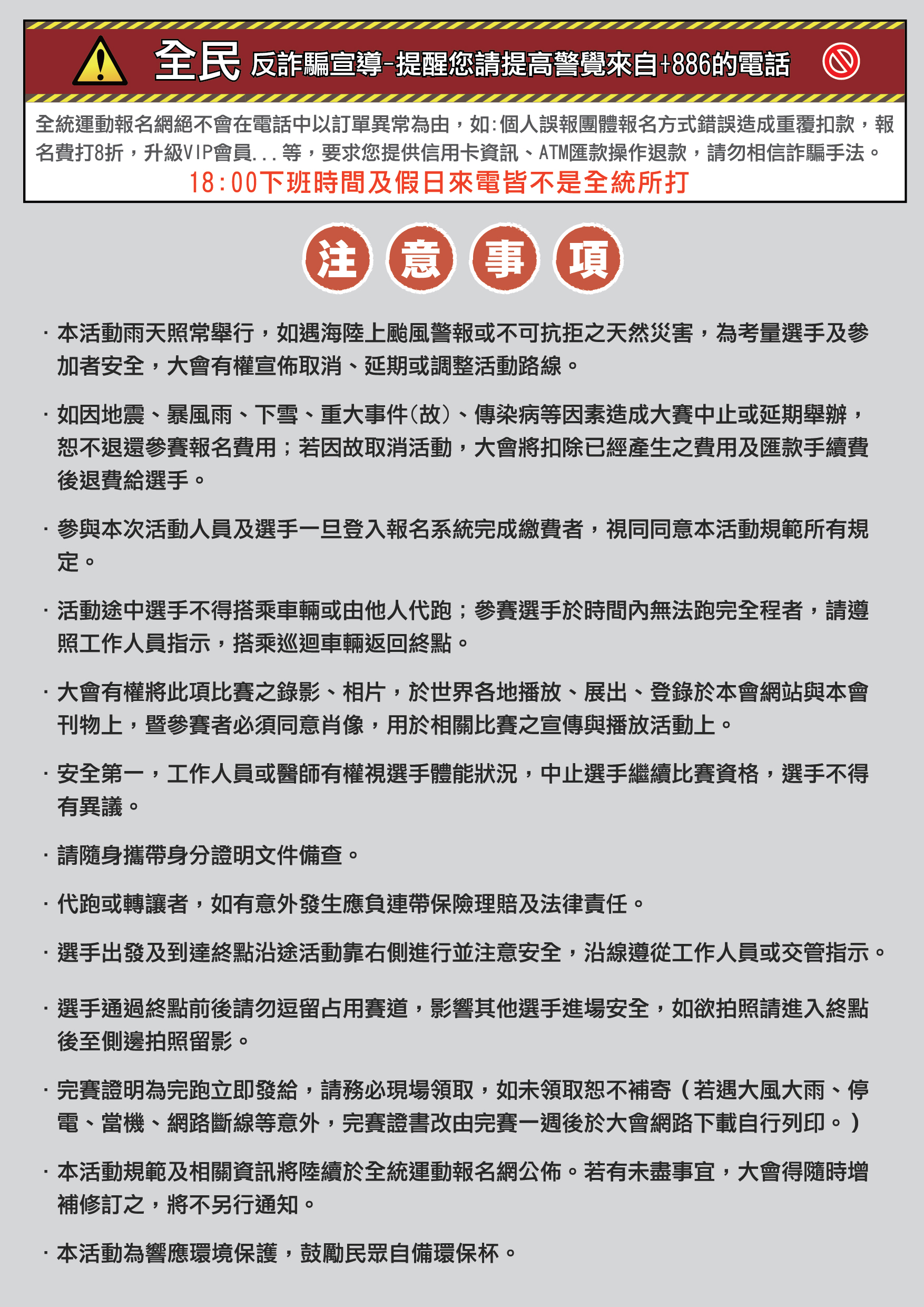 - 物資、號碼布若有缺漏請最慢於活動前三日致電全統報名網客服反應登記,否則一律視為遺失處理現場不補發。
