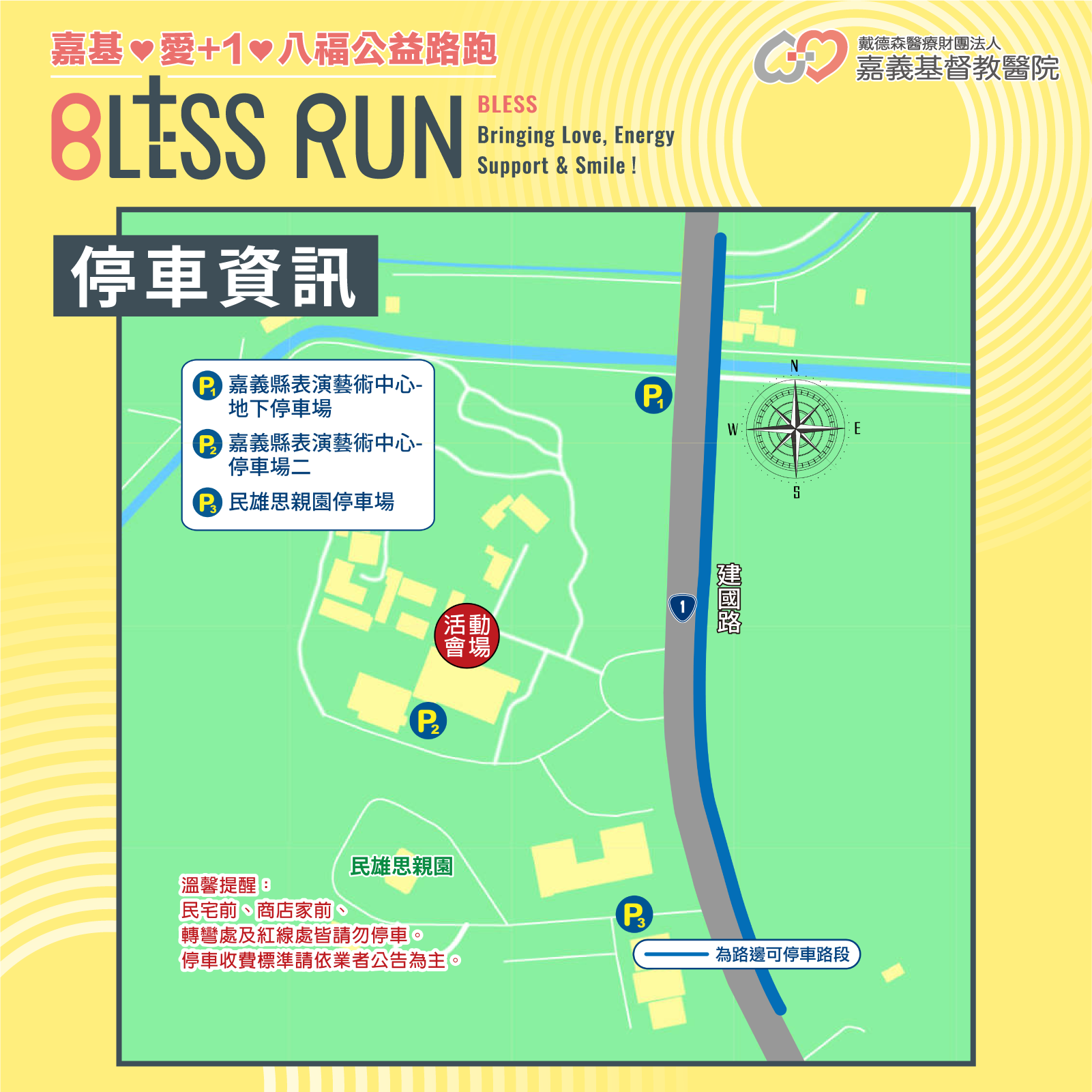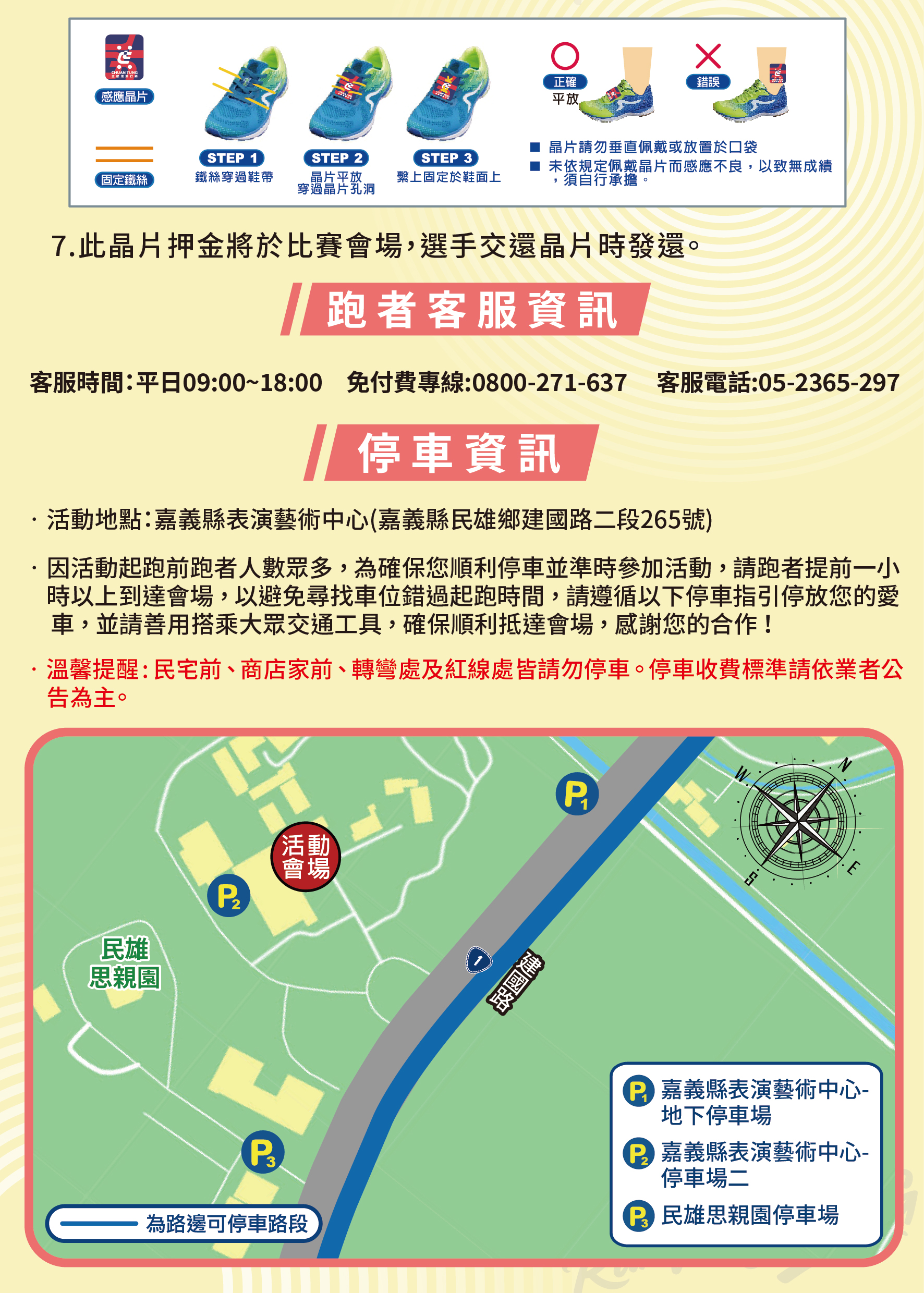 - 停車注意事項:因活動起跑前跑者人數眾多,為確保您順利停車並準時參加活動,請跑者提前一小時以上到達會場,以避免尋找車位錯過起跑時間,請遵循以下停車指引停放您的愛車,並請善用搭乘大眾交通工具,確保順利抵達會場,感謝您的合作!