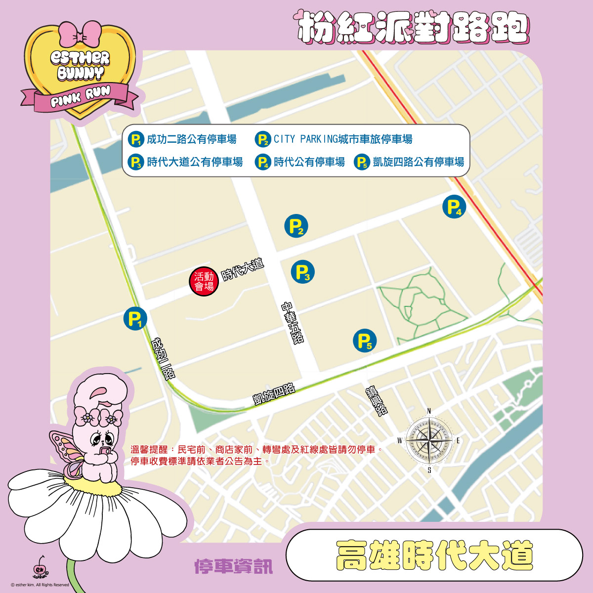 - 因活動起跑前跑者人數眾多,為確保您順利停車並準時參加活動,請跑者提前一小時以上到達會場,以避免尋找車位錯過起跑時間,請遵循以下停車指引停放您的愛車,並請善用搭乘大眾交通工具,確保順利抵達會場,感謝您的合作!