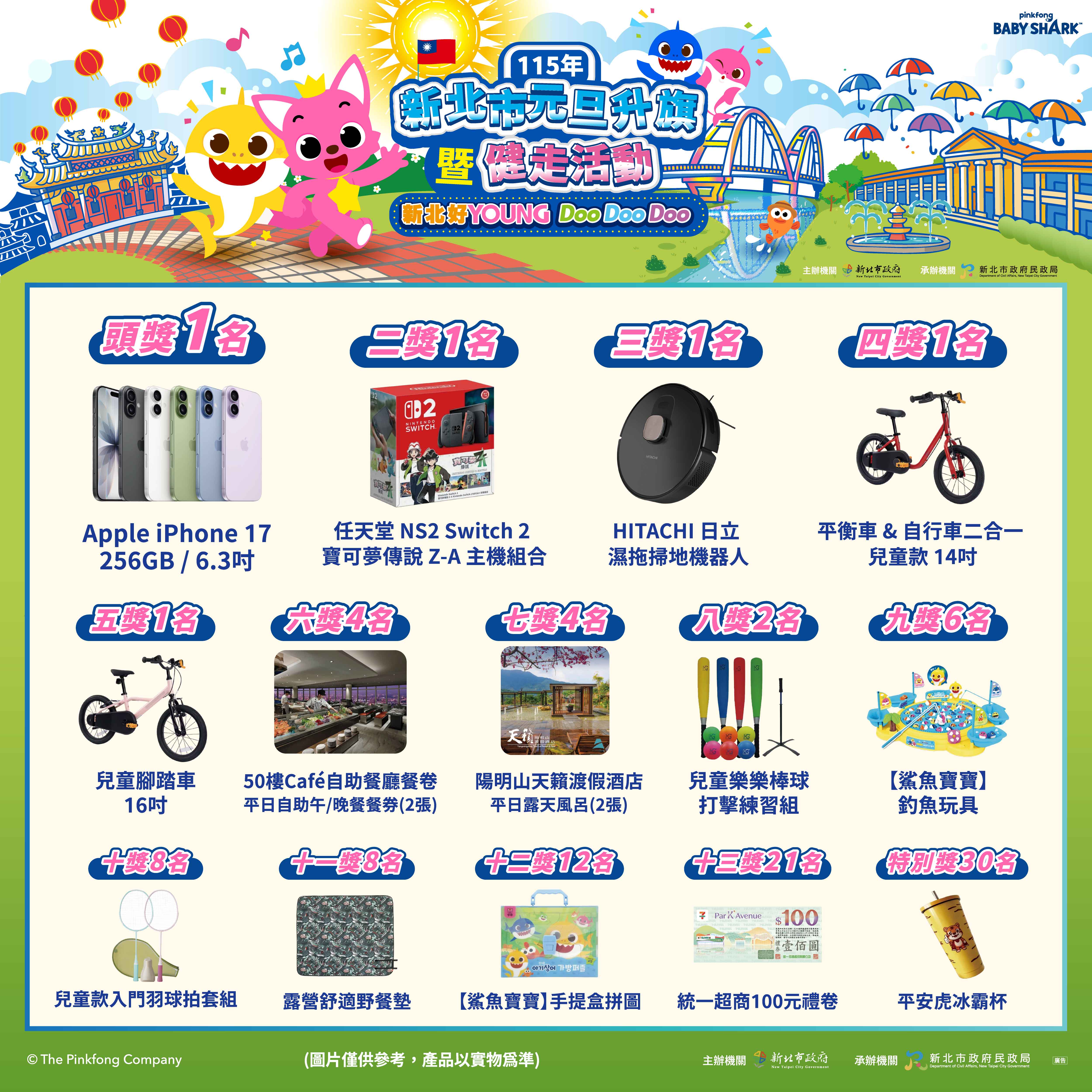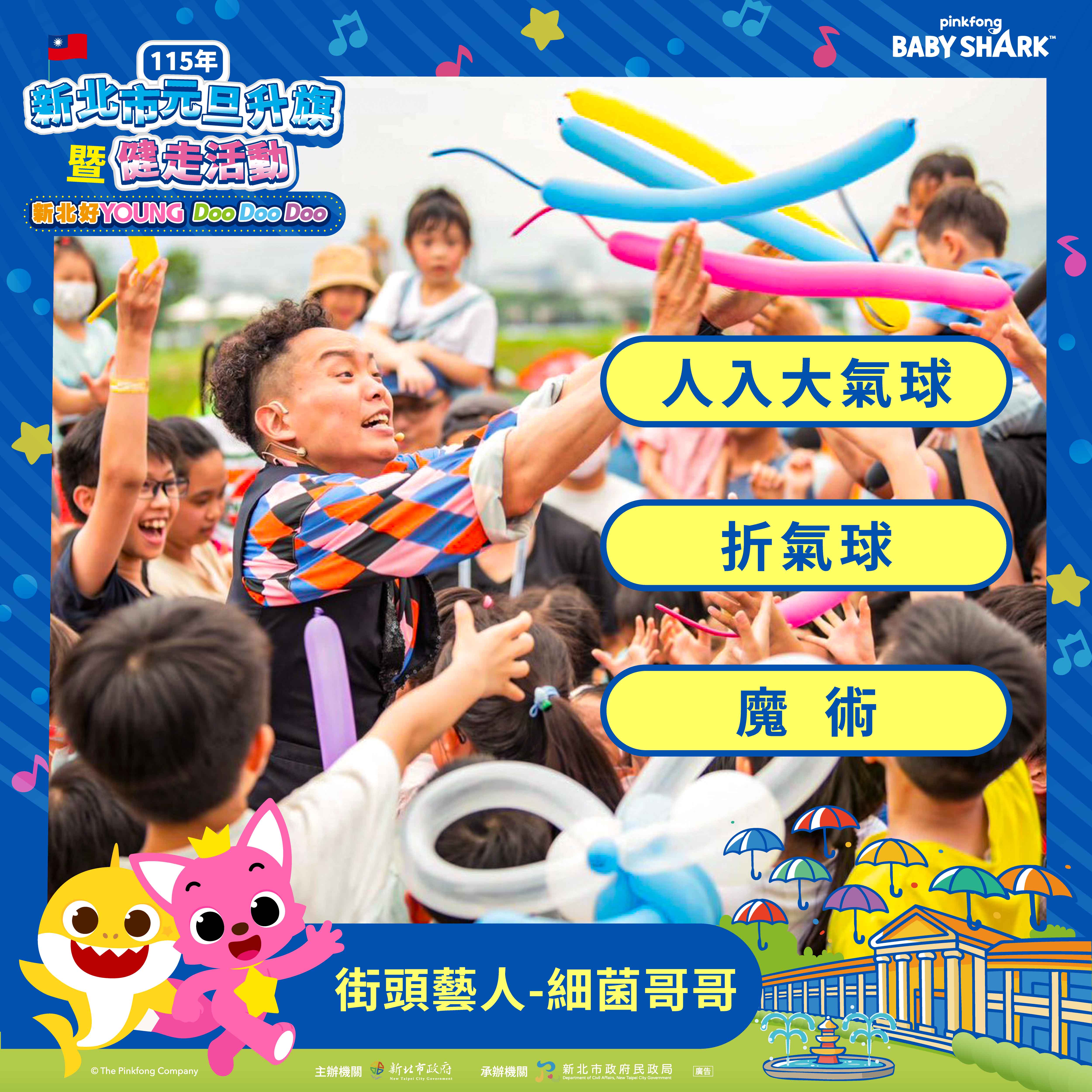 2026新北市元旦升旗暨健走活動,從上午9時至下午3時,首次邀請大家最愛的鯊魚寶寶及碰碰狐陪伴大、小朋友闖關、打卡拍照~