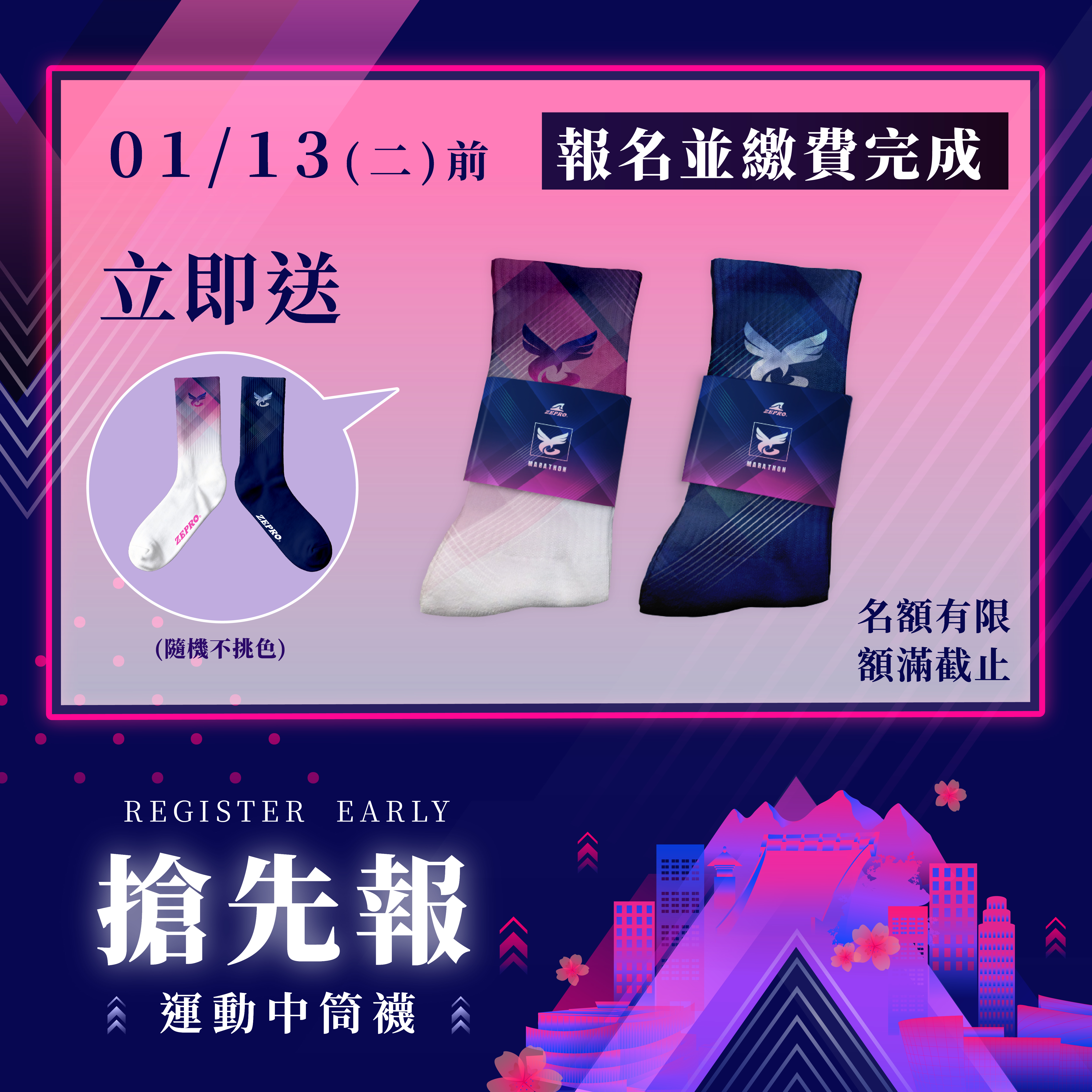 搶先報名禮:運動中筒襪 乙雙(隨機不挑色)。
