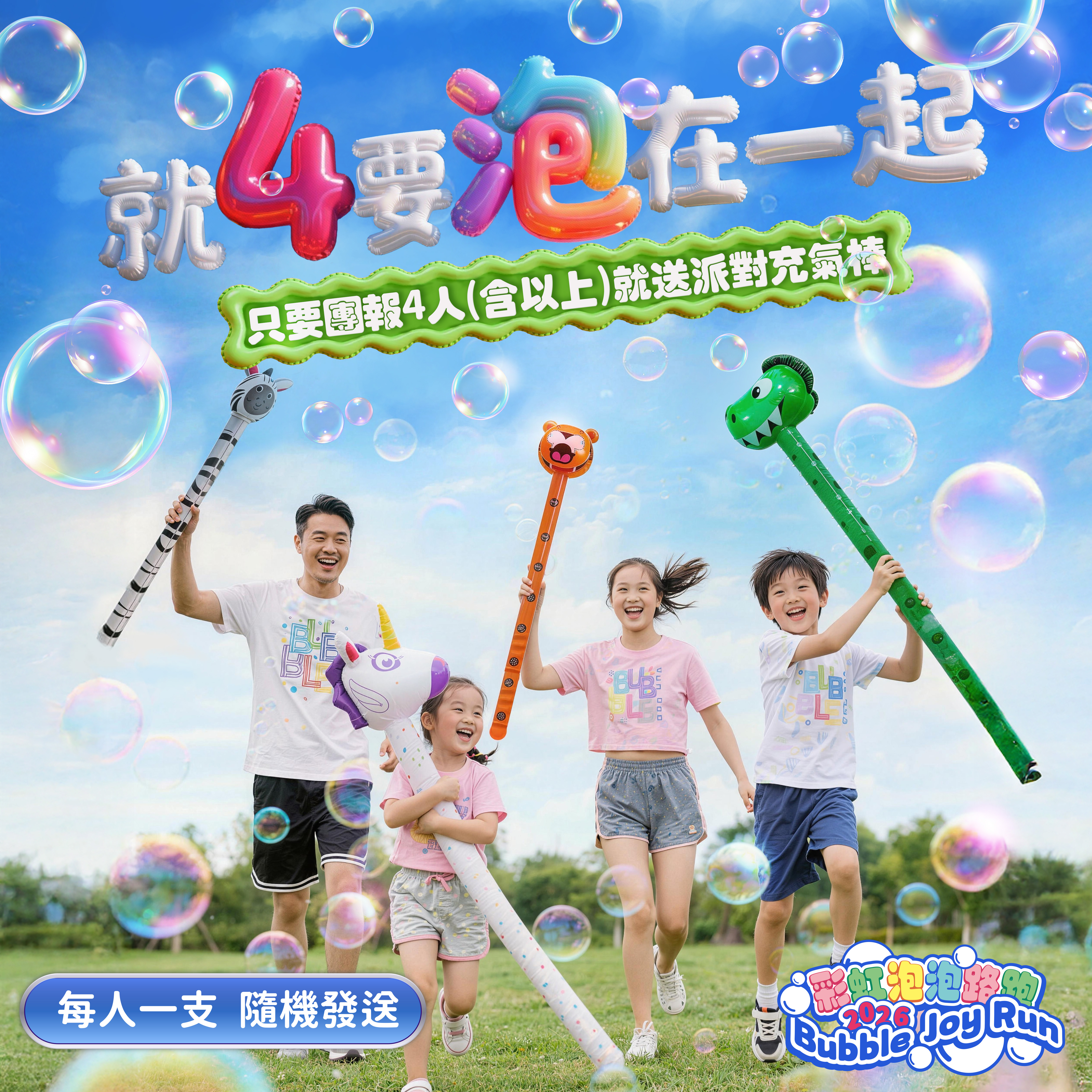 凡同一訂單編號報名人數達 4 人(含以上),每位團員皆可獲贈 1 支派對充氣棒。